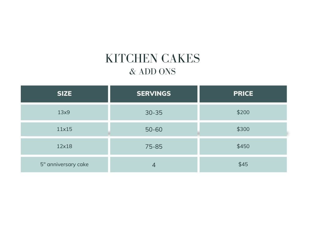 A reduced price per serving is offered on wedding kitchen cakes and pick up orders. Learn more about the increased price for delivered wedding cakes on our FAQ page